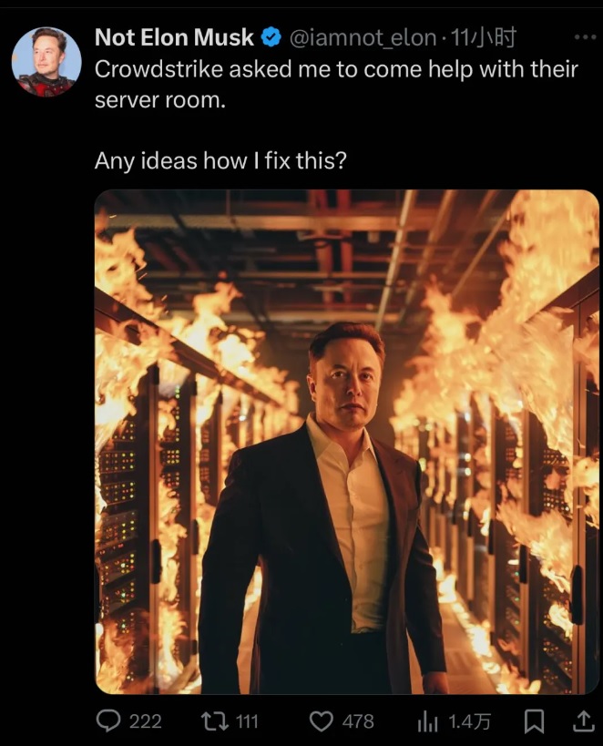 如今遭遇“微软蓝屏”事件,引发全球用户对CrowdStrike安全性的担忧。随后,X(原Twitter)上的“特斯拉创始人马斯克”恶搞账户发布了一张“火烧CrowdStrike机房”的AI生成图片。