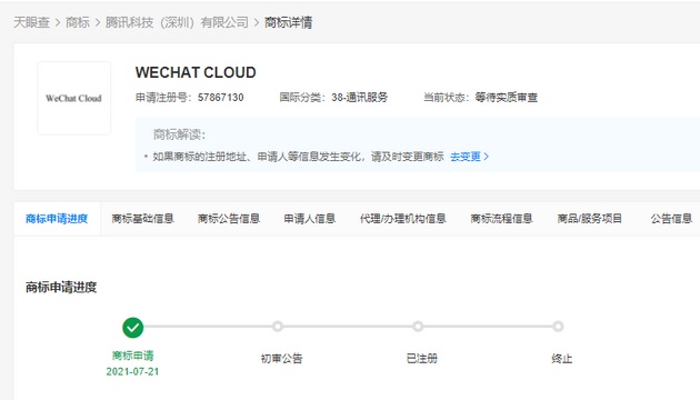 腾讯公司已于今年7月注册了“WeChat Cloud”商标,业务范围涉及网站服务、通讯服务、广告销售等,目前这一商标处于“等待实质审查”状态。如果只从这一工商信息变更的情况来看,微信云存储可能真的要来了。
