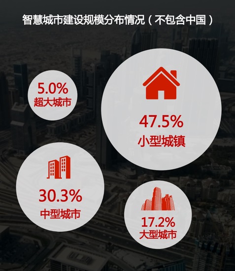 移动信息化研究中心整理全球智慧城市数据得出,当前全球范围内智慧城市建设规模偏小,主要集中于50万人口以下的小型城镇,而超过1000万人口的特大城市仅占5%。