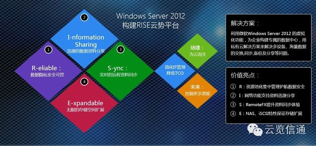 因此,云览信通选定了和Windows Server 2012进行紧密的合作,其相关的应用和产品全部会基于Windows Server 2012进行整合,利用微软Windows Server 2012 的虚拟化功能,为企业构建专属的数据中心,用私有云解决方案来解决多设备、海量数据的交换、同步、备份及分享等问题。