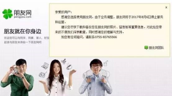 日前,腾讯朋友网官网发布公告,称“由于业务调整,朋友网将于2017年8月6日停止服务和运营。”并督促用户及时做好照片、留言板信息备份。