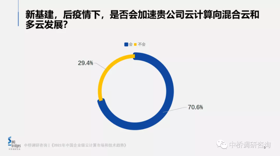 中桥调查数据显示(图2),新基建和后疫情下, 70.6%的企业级用户认为云计算将加速向混合云和多云发展。新冠疫情的爆发放大了企业数字化转型升级的迫切性,“新基建”战略与工业互联网,加快了企业上云平台和产业上下游的融合创新,云平台的重要性得到进一步凸显,经济中的很多功能和服务交付都要依赖云平台支撑现代化应用来实现。