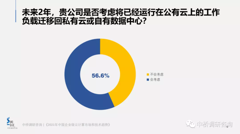 工业互联网加速工作负载向边缘端下沉和场景驱动私有云部署需求。相关调研数据显示*,85%的企业考虑将工作负载向自有数据中心迁移。中桥调查数据显示(图4),未来2年,56.6%企业级用户考虑将工作负载从公有云向私有云或自有数据中心迁移。公有云能够降低IT建设资金投入,简化管理运维。然而,随着数据资产价值快速提升,业务合规法律化进程加速,越来越多的企业开始将工作负载从公有云回迁到原有的数据中心或私有云。
