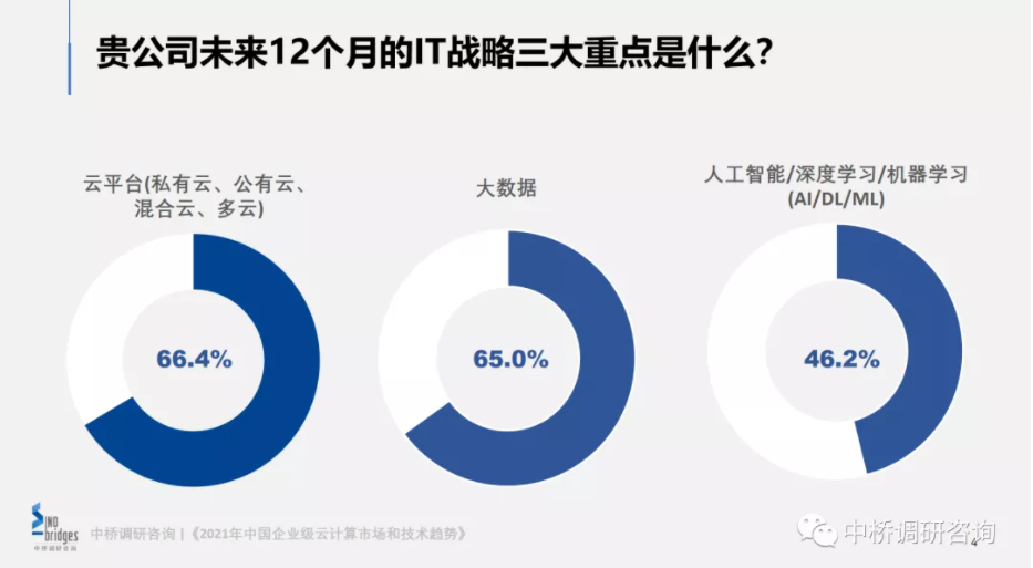 云计算依旧是企业在2021年的第一IT战略重点。中桥市场调查数据显示(图1),不论是中小企业还是企业级用户,其2021年的第一IT战略重点是建设云(私有云、公有云、混合云、多云)。