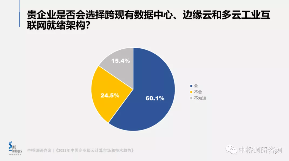 新基建加速企业布局工业互联网。中桥调出数据显示(图3),60.1%用户选择跨核心、边缘、云构建工业互联网生态平台,这将加速云去边界的趋势。