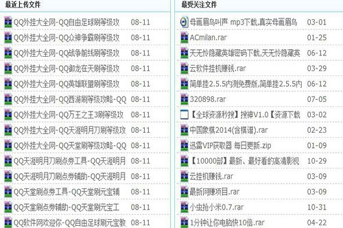 (1)游戏外挂。上图为某网盘产品当中截取的最近上传文件和最受关注文件,其中最近上传文件中,所有的内容皆为游戏外挂,而在最热门文件当中,也是由外挂以及其他软件组成。很明显,外挂是损害了游戏厂商的利益的。
