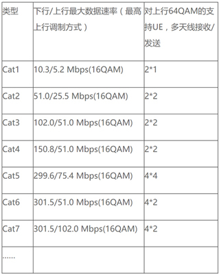通过下面这个LTE Cat(LTE网络传输速率等级)表格,我们可以看到LTE数据传输速率的爆炸性增长:
