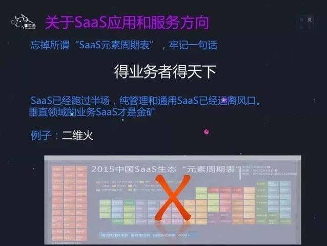有一句话说得好——得业务者得天下,其中的体量绝对是可以支撑独角兽的,值得大家一做。至于投资商,我认为大家最好不要再跟风了,因为SaaS已经跑过半场。
