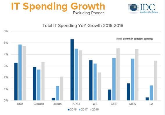 根据IDC最新的全球黑皮书显示,以不变货币计算,预计2017年全球IT支出将增加4.5%,相比去年的2.5%有显著提升,下半年最显著的就是基础设施和移动设备的更新周期更为强劲。